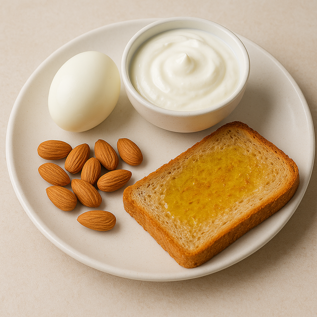 ไข่ต้ม 1 ฟอง + โยเกิร์ตรสธรรมชาติ + น้ำมันมะกอก 1 ช้อนโต๊ะ + อัลมอนต์ (10 เม็ด)