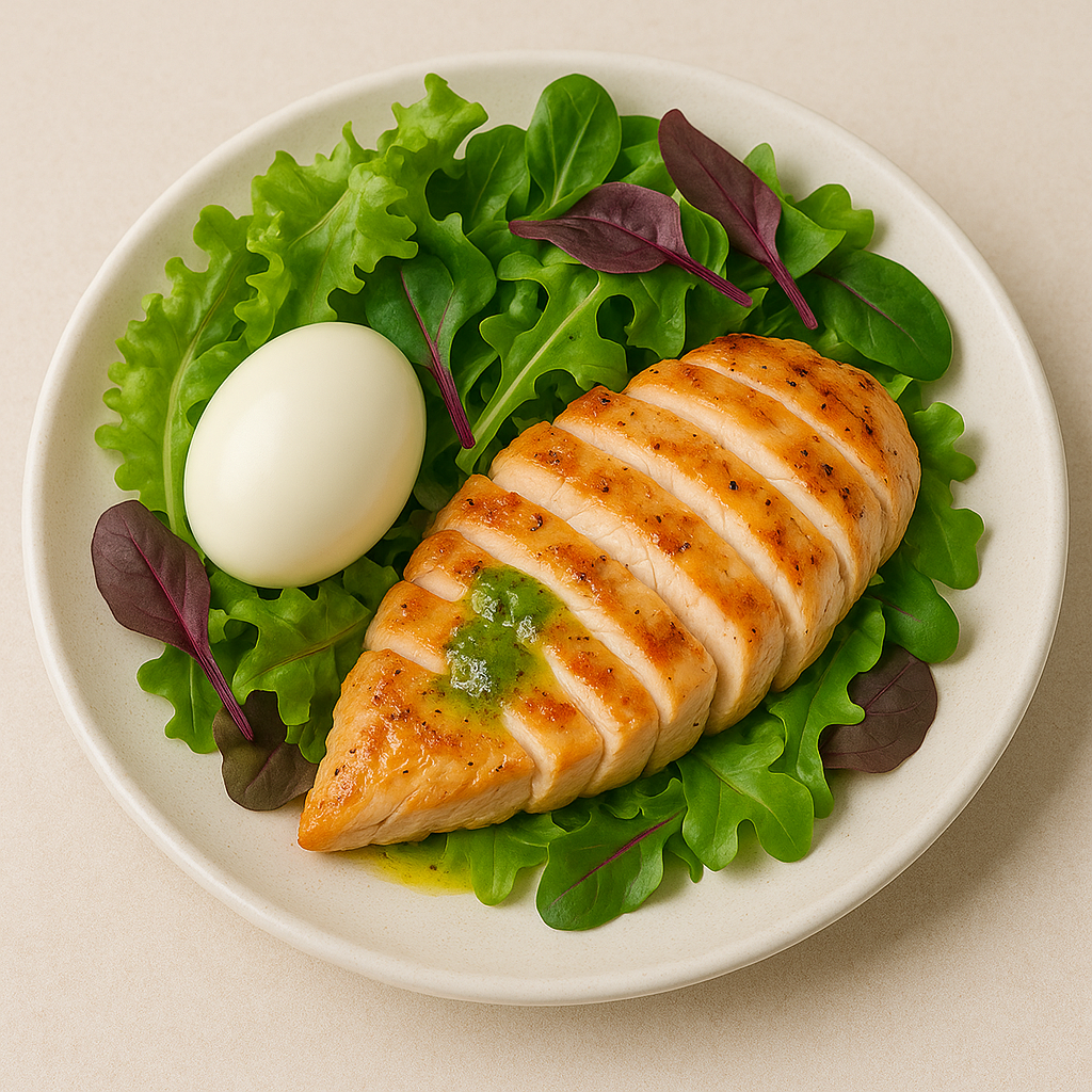 ไข่ต้ม 1 ฟอง + สลัดอกไก่ราดนำ้มันมะกอก 1 ช้อนโต๊ะ