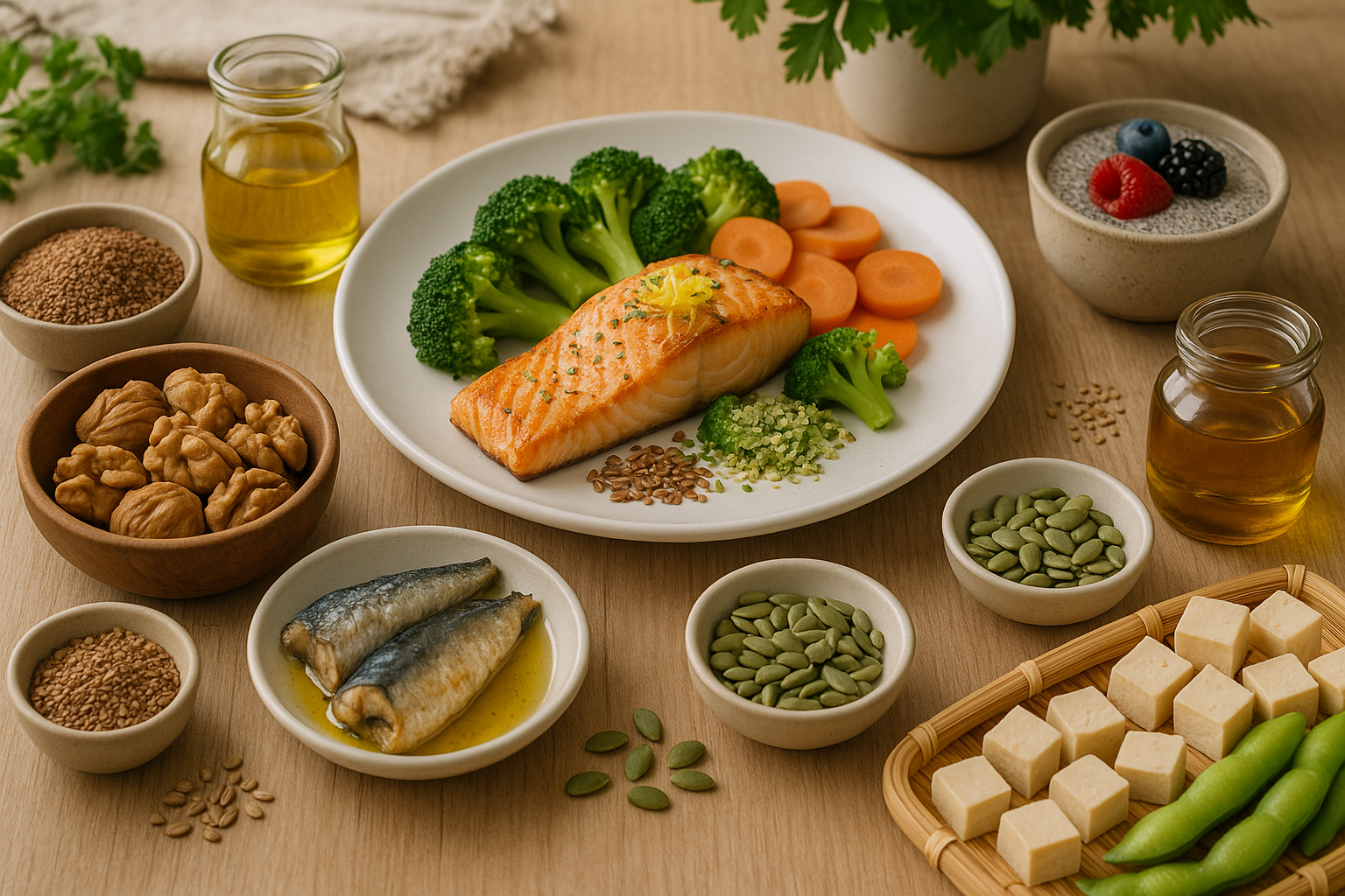 เมล็ดแฟลกซ์, เมล็ดเชีย,เมล็ดทานตะวัน, ถั่วเหลือง, ไขมันจากปลา, น้ำมันปลา