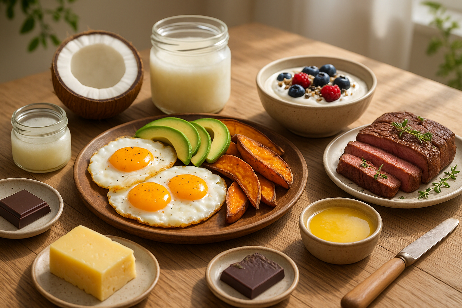 เนย, ชีส, สัตว์เนื้อแดง, น้ำมันมะพร้าว, น้ำมันปาล์ม, ไข่แดง