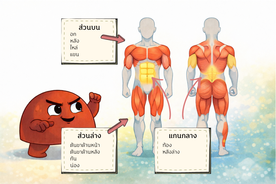 สัปดาห์ละ 2–4 ครั้ง ครอบคลุม กล้ามเนื้อหลักทั้ง 10 กลุ่ม